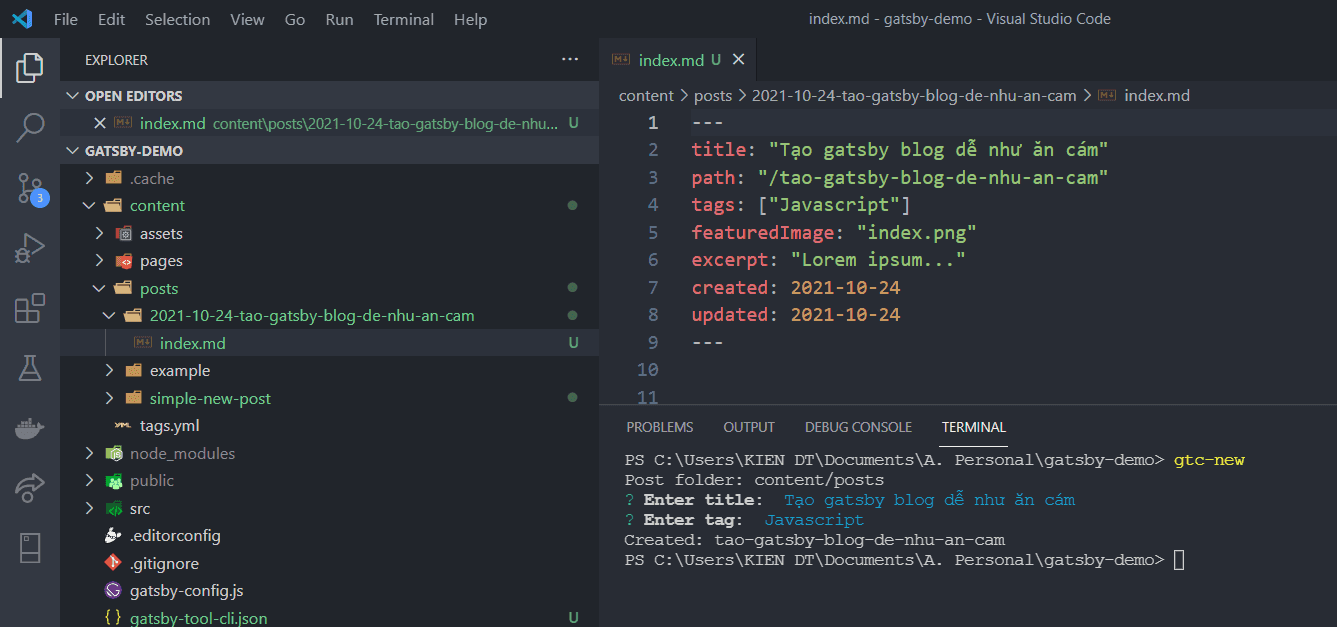 Để tạo bài viết mới, vẫn là lệnh gtc-new, nhập tiêu đề và tag, nó sẽ tự động tạo folder và slug phù hợp với folder của tiêu đề bạn nhập.