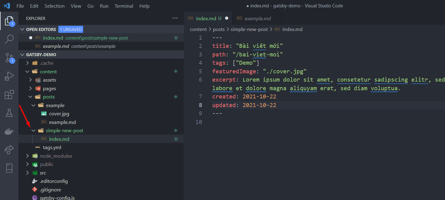 Bạn chỉ việc tạo thư mục con hoặc file markdown trong thư mục này, ví dụ ở đây mình tạo 1 bài viết mới bằng cách tạo 1 thư mục mới và file index.md phía trong nó. Copy phần frontmatter của bài viết example vào file này và chỉnh sửa theo ý bạn.