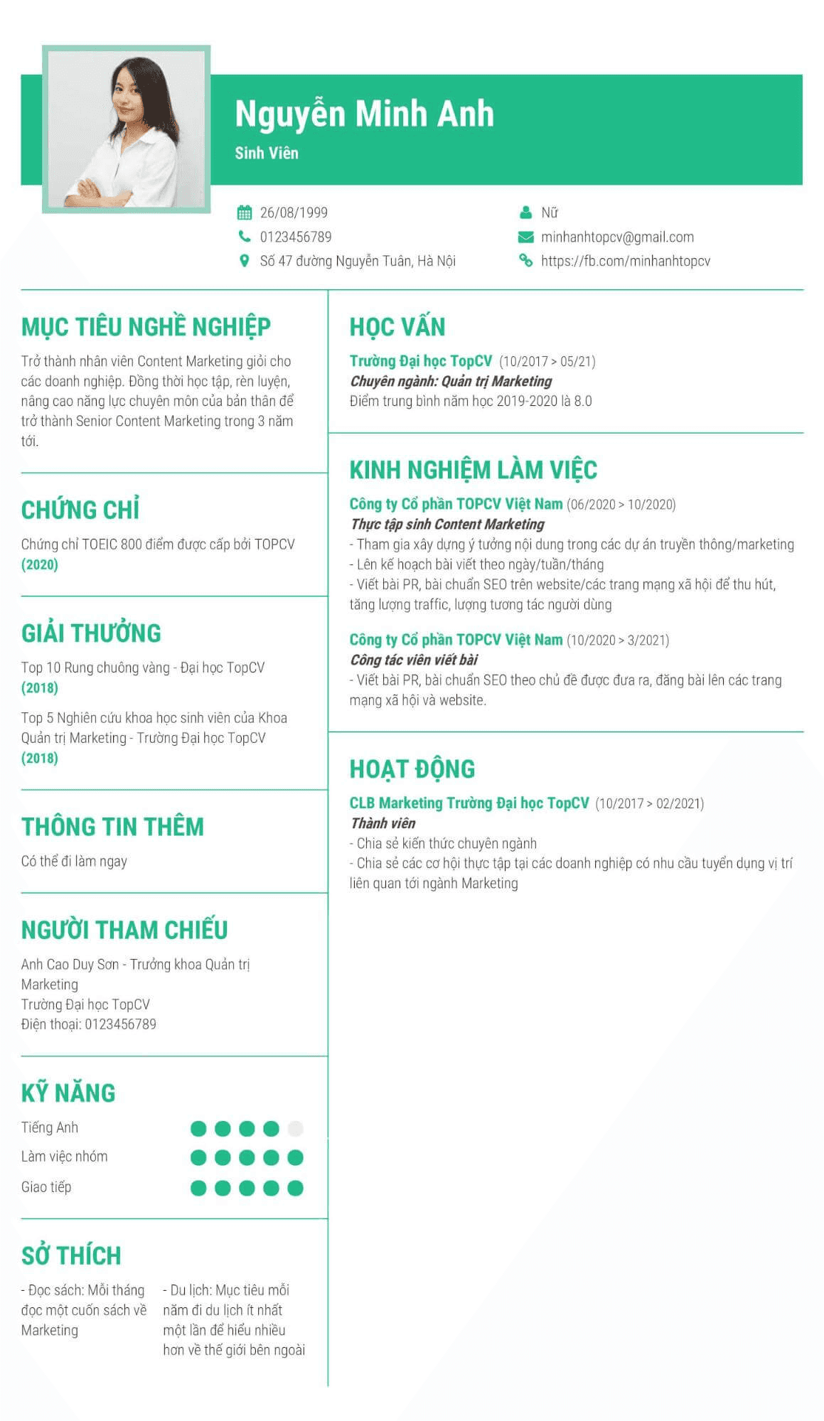 Thêm vào đó phần này cũng chứa những thông tin cơ bản như: ngày tháng năm sinh, giới tính, quốc tịch, thông tin liên lạc như số điện thoại và email, link mạng xã hội linkedin, có thể ghi thêm blog để làm nổi bật profile…