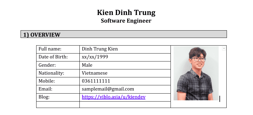 Mình sẽ lấy trực tiếp CV của mình, chỉnh sửa vài chỗ để làm ví dụ cho các bạn dễ hình dung nhé. Dựa vào outline trong này, các bạn có thể chỉnh sửa theo kinh nghiệm và thông tin của riêng các bạn.