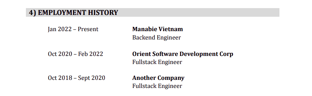 Lịch sử làm việc, cái này mình thấy có thể gộp lại với phần danh sách dự án, tuy nhiên mình thấy tách ra sẽ dễ đọc hơn và dễ trình bày hơn nữa. Phần này chỉ đơn giản là liệt kê các công ty mà bạn đã từng làm thôi, không có gì đặc biệt. Công ty nào làm gần đây thì nên được ở phía trên. (order by start_working_date DESC 😝)