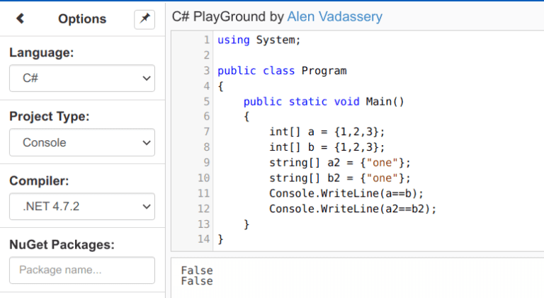 fmt.Println(fiveElements == fiveElementsClone) // trueNếu chúng ta làm vậy trong các ngôn ngữ khác như C#, Java, thì kết quả lại khác rồi (check thử đi là biết):