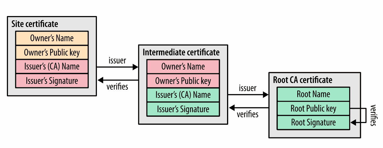 Chúng ta chia cái certificate chain thành 3 thành phần: Root CA đã được lưu trong máy client, middle certificate là từ các CA trung gian, còn Site certificate là trang web chúng ta truy cập.